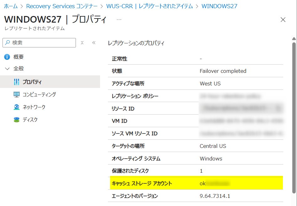 ※ すでに「レプリケーションの有効化」作業を実施済の場合、「どのストレージ アカウントをキャッシュ用として設定したのか」は、Azure ポータル画面 > 対象の Recovery Services コンテナー > レプリケートされたアイテム > [プロパティ]画面より確認可能です。