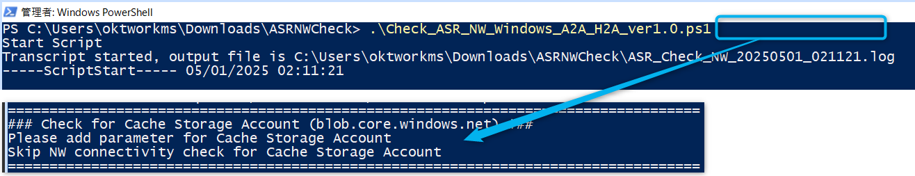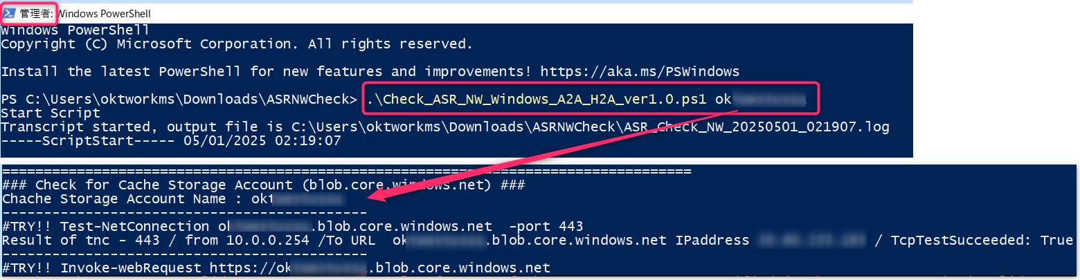 .\Check_ASR_NW_Windows_A2A_H2A_ver1.0.ps1 <キャッシュ用ストレージ アカウントとして設定しているストレージ アカウント名>