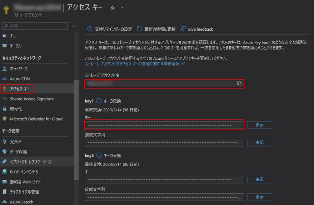 https://azure.microsoft.com/ja-jp/products/storage/storage-explorer/#overview - Azure ポータル画面 > ストレージ アカウント > [セキュリティとネットワーク] > [アクセス キー] > [ストレージ アカウント名] と [key] を確認しておきます。