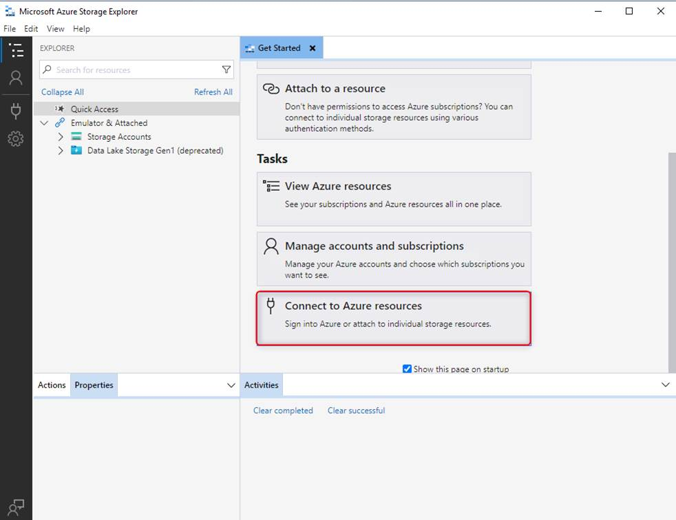 Azure Storage Explorer を起動し、Connect to Azure resources を選択します。