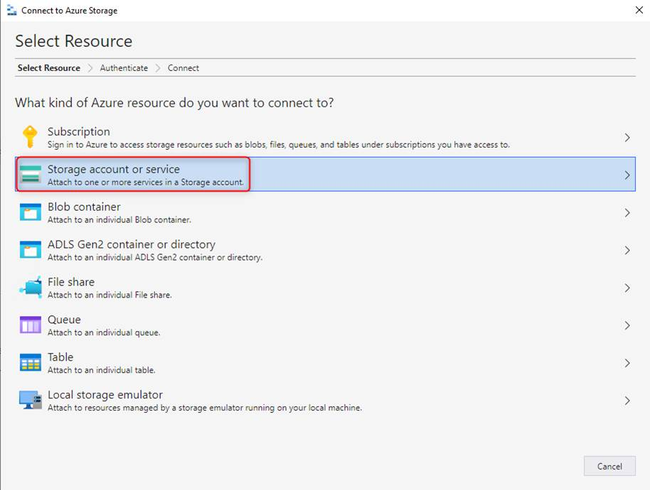 - Storage account or service を選択します。
