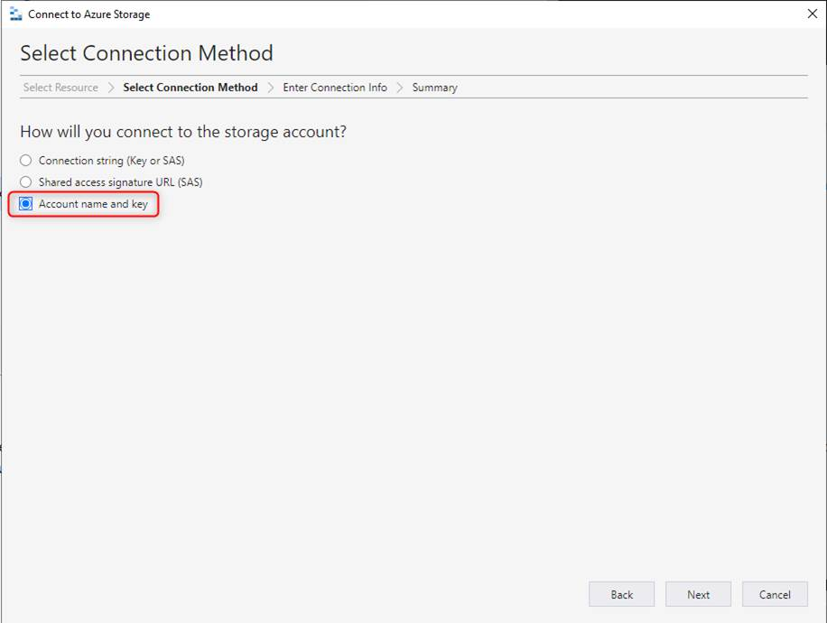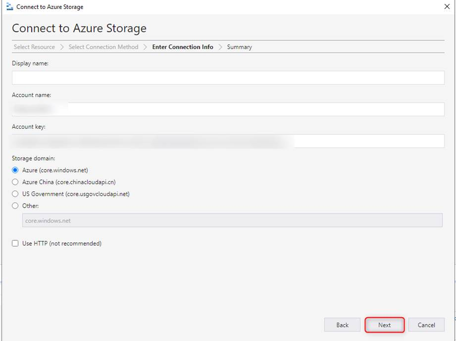 - Account name に、手順「2」で確認した [ストレージ アカウント名] を、Account key に [key] を入力し、Next クリックします。