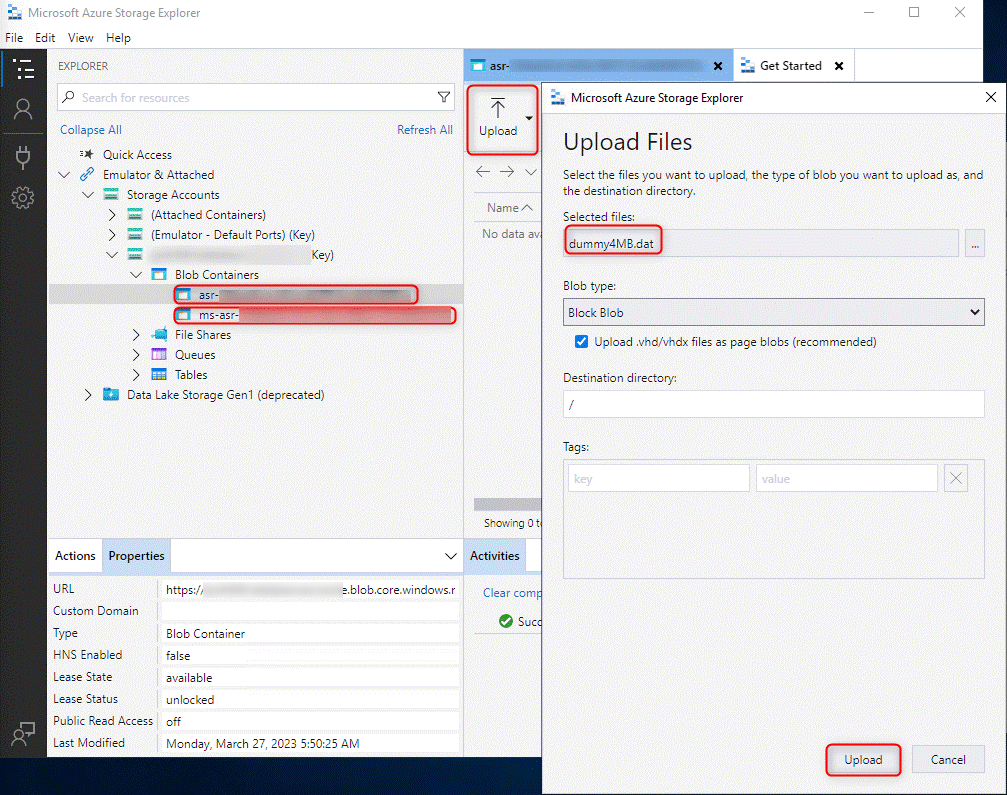 - (オプション 2 ) Azure Storage Explorer を使って、対象マシンから、適当なファイルをストレージ アカウントの BLOB コンテナーへとアップロードまでできるかを確認