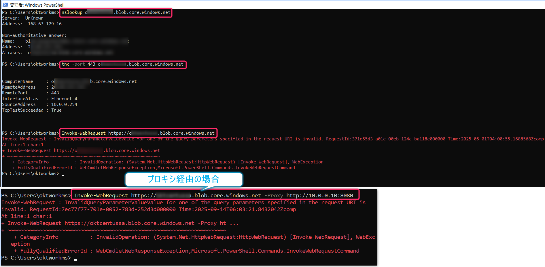 (4) (ストレージ アカウントを引数に渡している場合) Azure ストレージ アカウント (XXX.blob.core.windows.net) への「tnc」「Invoke-webRequest」コマンド実行