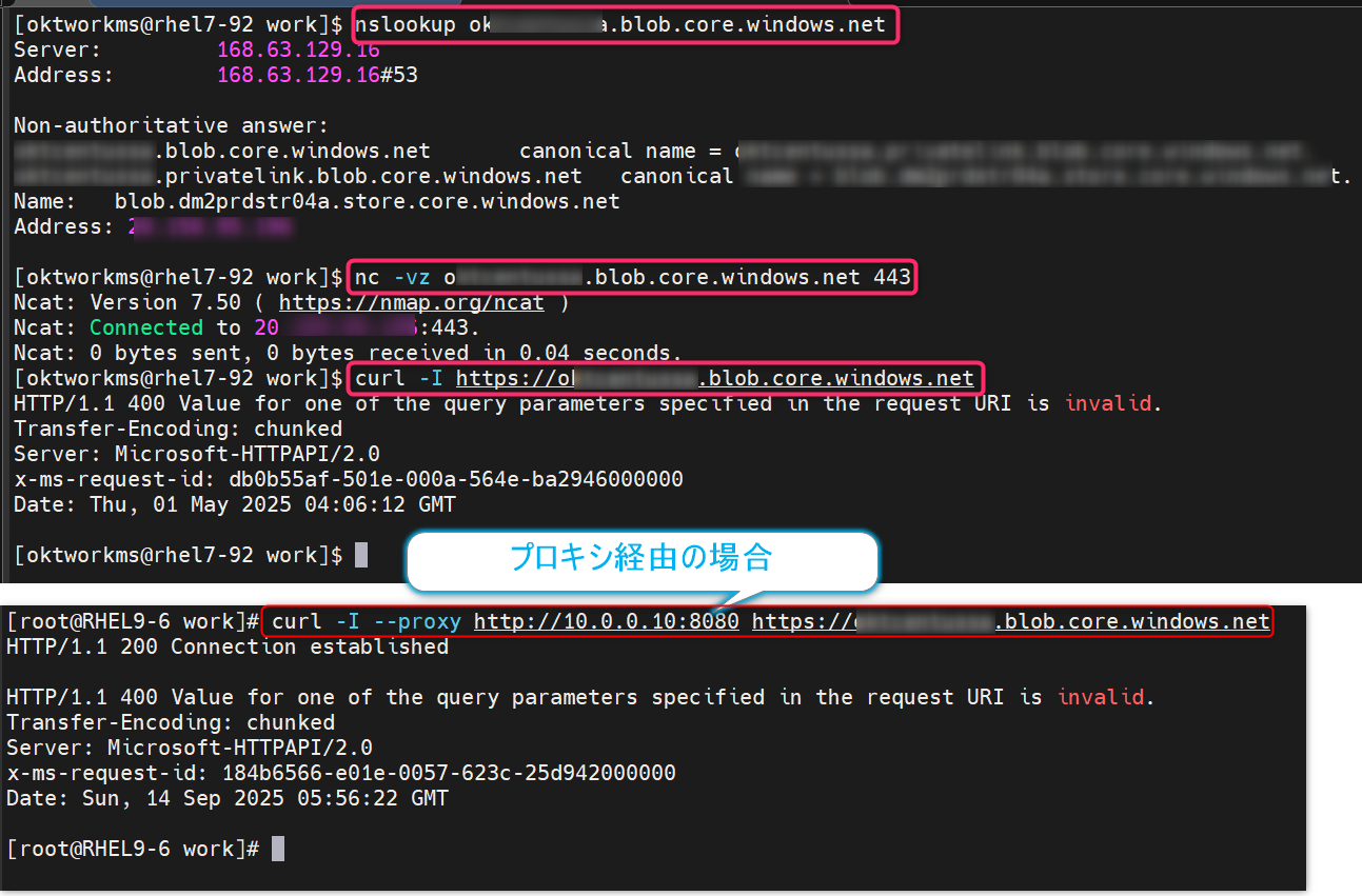 【Linux OS のマシンから確認する場合】nslookup <ストレージ アカウント名>.blob.core.windows.netnc -vz <ストレージ アカウント名>.blob.core.windows.net 443curl -I https://<ストレージ アカウント名>.blob.core.windows.net