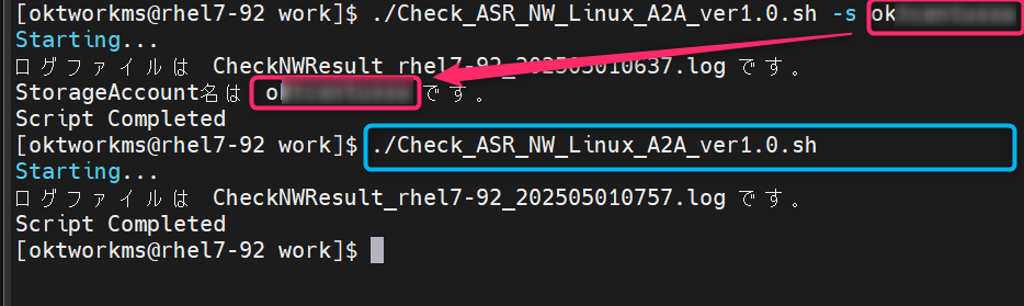 (実行例 1)./Check_ASR_NW_Linux_A2A_ver1.0.sh -s <キャッシュ用ストレージ アカウントとして設定しているストレージ アカウント名>
