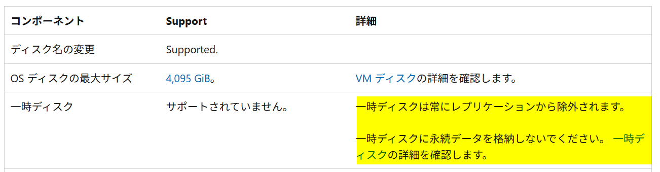 - (参考) Azure Site Recovery | Azure to Azure | サポート マトリックス | 一時ディスク