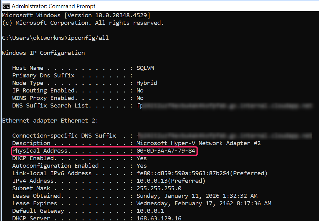 Windows OS の場合、ipconfig/all コマンドにて MAC アドレスを確認ができます。